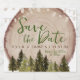 These beautiful rustic save the date sparkling wine labels will make an impression on your guests and wedding party. The gorgeous watercolor illustration design features a rustic wood slice layered with outdoor canopy lights and watercolor forest trees in various elegant shades of hunter green, dark chocolate brown, and shades of tans. Click the Edit Using Design Tool to make additional changes to this sparkling wine label.