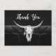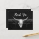 This thank you postcard features a rustic country western black and white bull cow skull rodeo cowboy wedding theme. Farmhouse style, old wild west vintage antique, cool, trendy, modern, stylish farm animal customised design with beautiful typography. Image copyright Marg Seregelyi Photography.