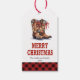 Saddle up your holiday spirit with this Western Christmas gift tag, where rustic charm meets festive cheer. Featuring classic red and green tones, cowboy boots, horseshoes, wagon wheels, and Wild West typography, this tag perfectly captures a cozy country Christmas vibe. Designed in a farmhouse-ranch style with touches of old-fashioned charm, it’s ideal for cowboys, ranchers, and lovers of the open prairie. Personalize it easily with your custom name or family message for a one-of-a-kind holiday accent. Whether tied to gifts, stockings, or party favors, this editable Yuletide Yeehaw tag adds warm, rustic flair to every present under the tree.