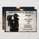 Set the tone for your special day with this Rustic Western Couple Barn Reception Invitation. Featuring a charming wood background that exudes rustic elegance, this invitation is perfect for a barn-themed celebration. A silhouette of a cowboy and cowgirl adds a romantic and authentic Western touch, making it ideal for couples who love country style. Personalise the text to include all the details of your reception, ensuring your guests know they’re in for a memorable time. Whether you’re hosting a casual gathering or a chic Western affair, this invitation beautifully blends charm and style.