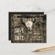 Rustic western budget wedding bull cow skull with horns vintage style save the date announcement flat card. Ranch grunge texture. Barn wood cowboy inspired. Antique sepia brown bison fine art. Brown background on back of card. Image copyright Marg Seregelyi Photography.