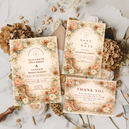 A romantic blush and peach floral design framed by a soft watercolor arch of roses, garden blooms, and airy pampas accents. Warm neutrals and muted sage greenery create an elegant, timeless aesthetic with a subtle western touch from the hat and rope detail. The composition feels refined yet natural — perfect for a boho western celebration, ranch wedding, or romantic garden ceremony. Fully customizable with your names and event details.