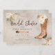 Rustic western themed bridal shower invitation features a watercolor boot, three floral arrangements, an arrow and a wood-like watercolor background. This cowgirl or western themed bridal shower invitation is great for someone having a country or western style wedding.