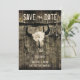 Rustic wedding western bull cow skull with horns vintage style save the date announcement flat card. Ranch grunge barn wood texture. Cowboy inspired design. Antique brown sepia bison fine art. Image copyright Marg Seregelyi Photography.