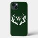 Rustic white deer antler silhouette with custom monogram letter in white. The background is hunter green be can be customised. This rugged case makes a great deer hunter gift.