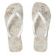 These flip flops feature a background of white lace on a light brown background and dark brown customisable text, at the top toe area, that reads: Bride.