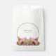 This design features a rustic wild flower bouquet. A simple gold circle frame encircles the text. The rustic pink floral colour tones compliment the greenery of the leaves. The gold tones tie everything together to create a rustic country woodland garden feel. Golden and pink stripes cover the back of the design. Elegant wedding favour bag design with modern elements. Matching wedding invitations and other stationery items are also available.