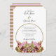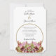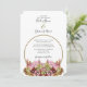 This design features a rustic wild flower bouquet. A simple gold circle frame encircles the text while the bride's and groom's names are positioned on top. The rustic pink floral colour tones compliment the greenery of the leaves. The gold tones tie everything together to create a rustic country woodland garden feel. Golden and pink stripes cover the back of the design. Elegant wedding invitation design with modern elements. Matching wedding stationery items and other wedding invite formats are also available.