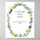 This is a rustic wildflower and greenery themed sign that you can customise for any purpose. The design features a wreath made with a variety of spring wildflowers including yellow daffodils, purple pansies, clovers, lavender, sweetpeas, dandelions, tulips and fern and ivy greenery. It also includes a few ladybirds and a sweet dragonfly.