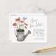 Rustic save the date postcard featuring a bouquet of watercolor wildflower such as poppies, cornflower and grass in a water can.
