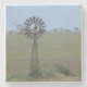 Old-style windmill in a rural countryside. Expansive farm fields draw your gaze over to trees on the horizon and up into pale blue sky.