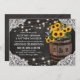 Stylish country wedding invitations featuring a rustic black chalkboard backdrop, bridal lace corner decoration, string twinkle lights, summer golden yellow sunflowers, a winery wooden barrel wiith your initials and a piece of knotted string.