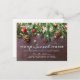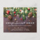 Rustic country new address announcement postcards featuring a dark wooden background, festive christmas tree branches, red & gold tree decorations and string twinkle lights.