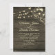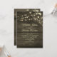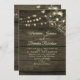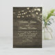 Elegant, modern calligraphy rustic wood wedding invitation with monogram at the back, string lights and faux gold floral lace.