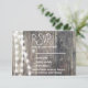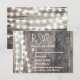 Rustic wood and string lights wedding RSVP. vintage grey wood background decorated with string of lights. Perfect wedding invite for wedding with night lights wedding theme, barn theme, garden theme, outdoor wedding with twinkle lights.