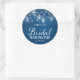Rustic Bridal Shower round sticker featuring lights in mason jars and strings of lights with the word "Bridal Shower" against a blue wood pattern background. It's the perfect sticker for a rustic or country bridal shower. Check out matching invitation and items like stickers and stamps here https://www.zazzle.com/collections/rustic_wood_mason_jars_and_lights-119202204970019494?rf=238364477188679314