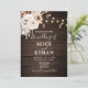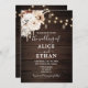 Introducing our enchanting Rustic Wedding Invitation, the perfect choice for your fall wedding celebration. The design features a beautifully illustrated rustic wood backdrop, evoking the charm and warmth of an autumnal setting. At the top of the card, a stunning watercolor boho arrangement of flowers in soothing neutral colours is gracefully presented, illuminated by the gentle glow of string lights, adding a touch of magic and romance. The invitation elegantly combines text in a classic serif font with a modern script, highlighting the heading "The Wedding of" in a captivating script font. This invitation is an ideal selection for couples looking to capture the essence of a fall wedding, merging rustic allure with modern sophistication. Set the stage for your special day with an invitation that not only announces your event but also reflects the beauty and unique spirit of your love story.