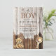 A cute rustic boy baby shower invitation featuring a two tone sepia and brown barn wood with teddy bear and rattle. For a rustic modern vibe, with the phrase "oh boy"!