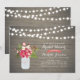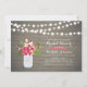 A rustic bridal wedding shower invitation featuring mason jar & flowers, lights on a wood background.
