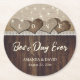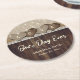 Custom rustic wedding paper coasters featuring burlap hearts, lace and string lights on a rustic wood background. Easily personalise these wedding coasters online with your wedding details.