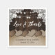Decorate your rustic country, backyard or barn wedding party with these custom wedding paper napkins featuring burlap hearts against a burlap and rustic wood background adorned with string lights and white floral lace.