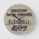 A funny "Whatever, we're camping" quote on a rustic driftwood planks background.