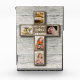Modern First Holy Communion illustration featuring a wooden cross with pinned communion related images on a rustic background. Easily to change the 2 sample photos of the communicant with your own pictures to personalise the product.