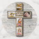 Modern First Holy Communion illustration featuring a wooden cross with pinned communion related images on a rustic background. Easily to change the 3 sample photos of the communicant with your own pictures to personalise the product.