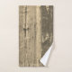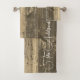 On this stylish towel set is a rustic design of  brown weathered wood planks creating country charm where  you can personalise on the large towel with a family name or logo.  Modern cottage charm decor