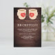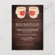 Elegant reception card featuring beautiful monogram coffee mugs with modern typography against a barn wood background.