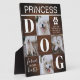 Pet memorial tribute picture plaque featuring 4 photos of you beloved doggy, a rustic wood pattern background, letters that spell out DOG, the words "forever in our hearts", a dogs paw with a remebrance saying, and their name.