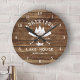 This personalised rustic family lake house clock features a lakeside cabin nestled at the base of pine trees and a guy in a boat fishing, on a brown wood background, with family name and lake house location.