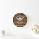 This personalised rustic family lake house clock features a lakeside cabin nestled at the base of pine trees, on a brown wood background, with family name and lake house location.