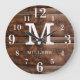Monogrammed wall clock with a dark brown wood texture background. Personalise the family clock with your family name and monogram initial letter.