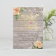 Bridal Shower Invitation Card Templates - Faux Gold Foil Script with Peach White Roses Floral and String Lights on Rustic Wood Background.