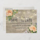 Save The Date Wedding Invitation Postcard Templates - Peach White Roses Floral and String Lights on Rustic Wood Background.
