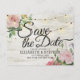 Wedding Save The Date Postcard Templates - Vintage Watercolor Pink Flowers and Elegant String Lights on Rustic Light White Wash Soft Wood Texture Background.