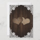 Rustic country greenery wedding save the date card featuring two burlap hearts on a barn wood background adorned with eucalyptus foliage and string lights. Two burlap hearts and white floral lace against rustic wood background at the back.