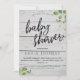 Rustic Wood Greenery Typography Baby Shower Invite is a very modern design with an elegant script title saying baby shower in black over rustic white painted wood background. The baby shower invitation is decorated with watercolor greenery and leaves. The text is ready to be customised to fit your event.