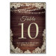 Rustic, country barn wood, ivory lace and string lights wedding reception table number sign personalised with the bride and groom's names and wedding date. Printed on both sides for two-sided viewing. Contact the designer if you'd like this design modified or on another product to complement your wedding suite or reception decor and supplies.