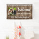 Honour the special couple and greet your guests with this personalised photo welcome sign featuring a rustic, country, brown barn wood background with a lace border.