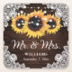 Custom rustic wedding paper coasters featuring sunflowers on a barn wood background adorned with white floral lace and string lights. Matching items available to complement these rustic chic sunflower wedding square paper coasters.