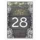 Rustic string lights, barn wood and vintage lace wedding table number card