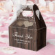 Put your rustic country bridal shower/wedding gifts into these rustic wedding thank you favour boxes featuring white floral lace and string lights on a barn wood background.