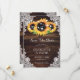 Rustic country floral wedding save the date cards featuring sunflowers on a wood background adorned with white floral lace and string lights. Matching items available.