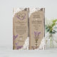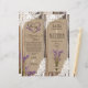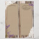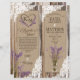 Rustic wood with white lace and lavender flower bouquet in mason jar with burlap, lace, and twine trims over linen-look text background and heart etching with monogram country style wedding program.