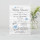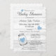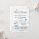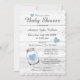 Elegant blue and white rustic mason jar baby shower invitations for new baby boy. Custom party invites with white wood grain panel and little white faded hearts in light pastel blue. Customisable scallop cutout shape. Beautiful stylish script typography with cute love symbol silhouettes. Personalizable template with RSVP and registry line. Sweet vintage outdoor barn style babyshower cards for your little prince boy or princess girl. Trendy country chic stationery paper designs for pregnant women / mum to be or mummy with newborn. Part of matching collection including gorgeous envelopes and other very pretty accessories.