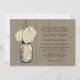 Perfect for a country style wedding or maybe you just love Mason Jars! Mason Jar hanging on a hook filled with country wildflowers. A Rustic Brown Barn Wood Background with the hanging Mason Jar and ivory hydrangea flowers. If you have any questions on this design or want a colour change please email me paula@labellarue.com Also check for the RSVP, RECEPTION and GUEST SEATING Cards to match!