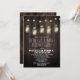 Rustic Barn Wood + Mason Jar Rehearsal Dinner Invitations - features reclaimed barn wood as the background and hanging lighted mason jars with fireflies or just plain lights. The mason jars are strung on string lights.