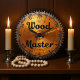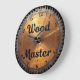 This image features a round wall clock designed to look like a distressed, metallic circular saw blade with a warm, coppery tone. The clock face has a brushed, textured appearance in shades of orange and brown, suggesting aged metal, with some visible scratches and wear. The outer edge of the clock forms the jagged teeth of a saw blade, rendered in a darker, rusty brown. The words "Wood Master" are boldly inscribed in the centre of the clock face in a strong, dark script. "Wood" is in a larger, flowing script, while "Master" is a larger, more structured script below it. The numbers 1 through 12 are visible around the clock face in a dark brown, matching the text. The clock has black hour and minute hands. This clock is ideal for a woodworking shop, a garage, or as a unique gift for a carpentry enthusiast.
